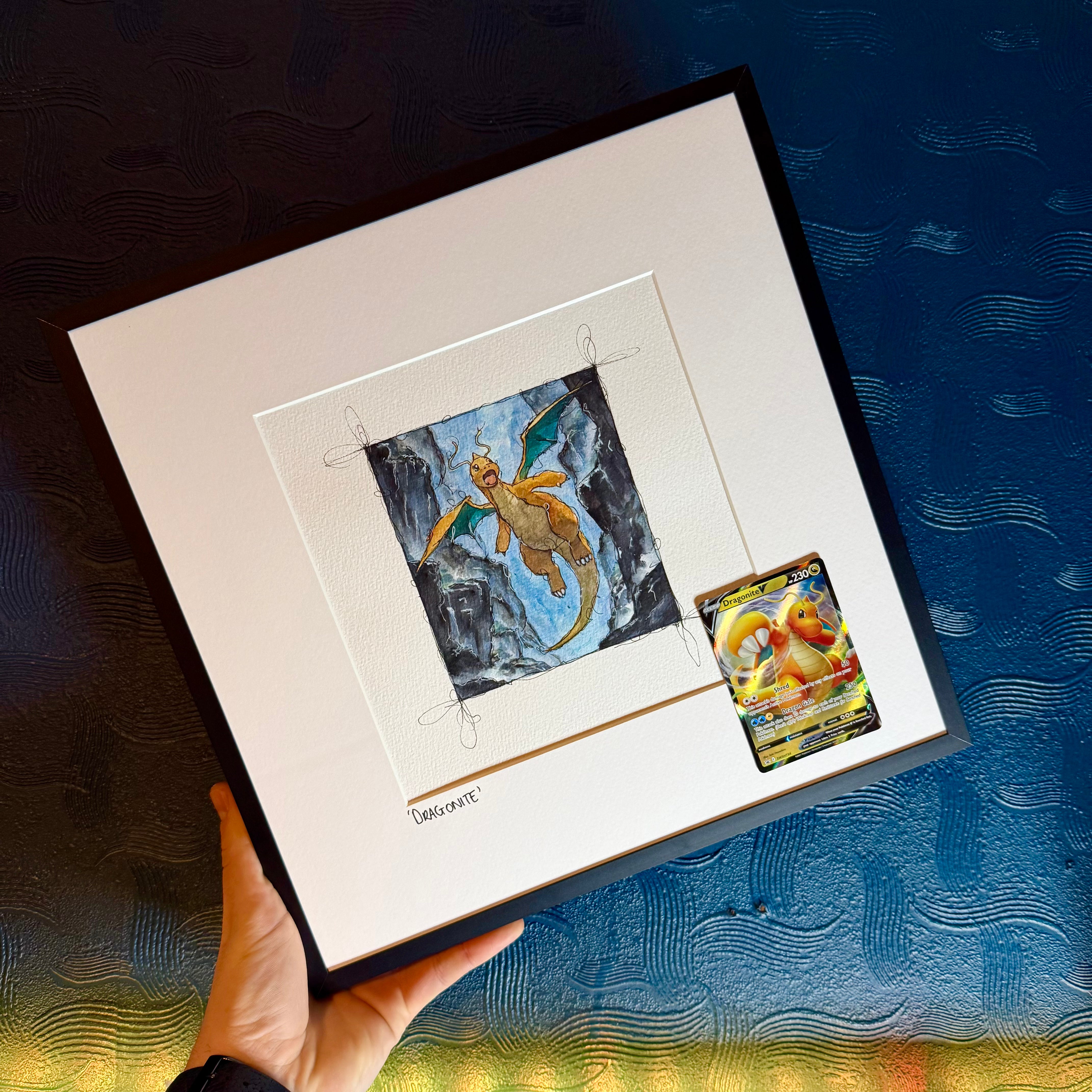 This is the original watercolour, ink & fineliner illustration framed with an Original Art Rare Pokémon Card.