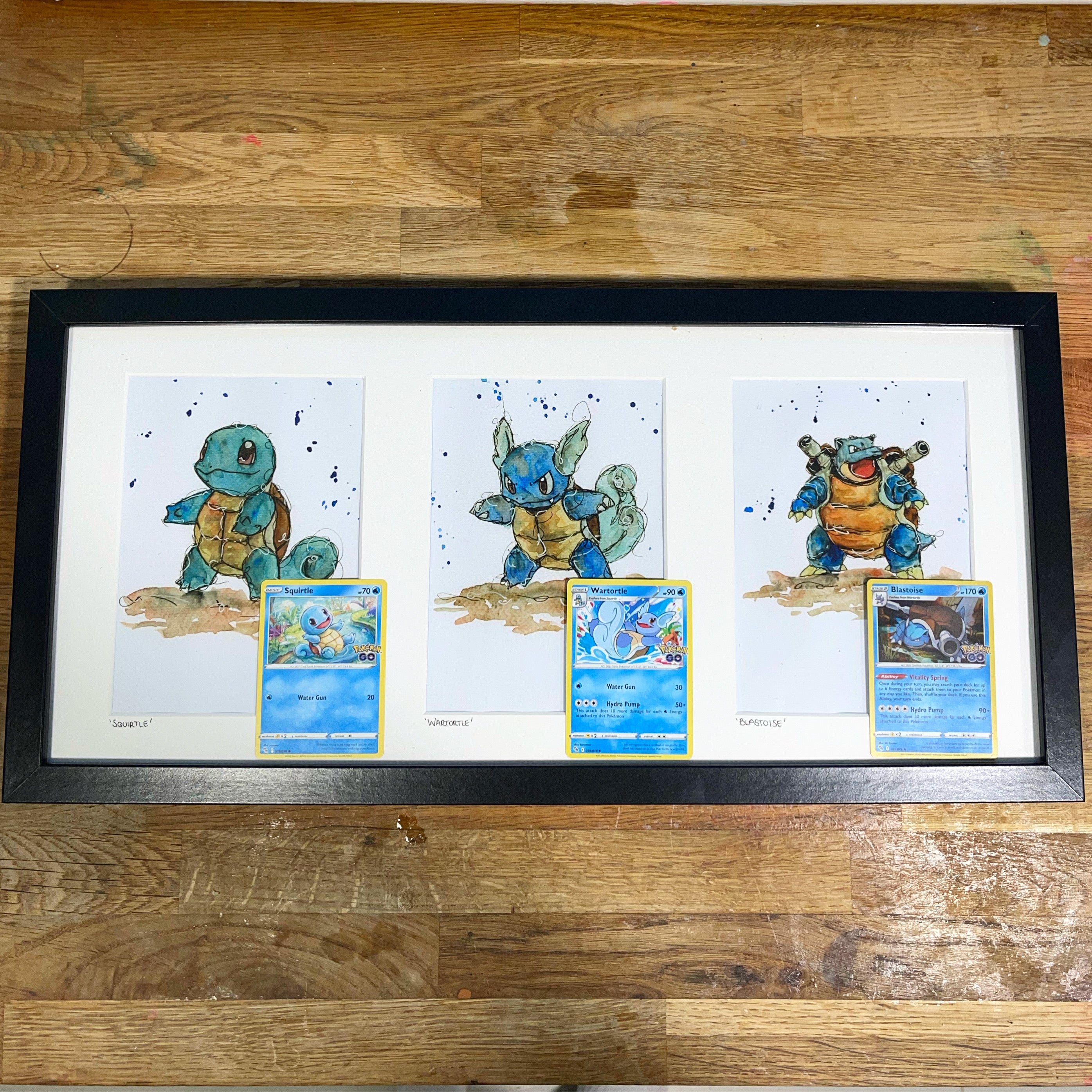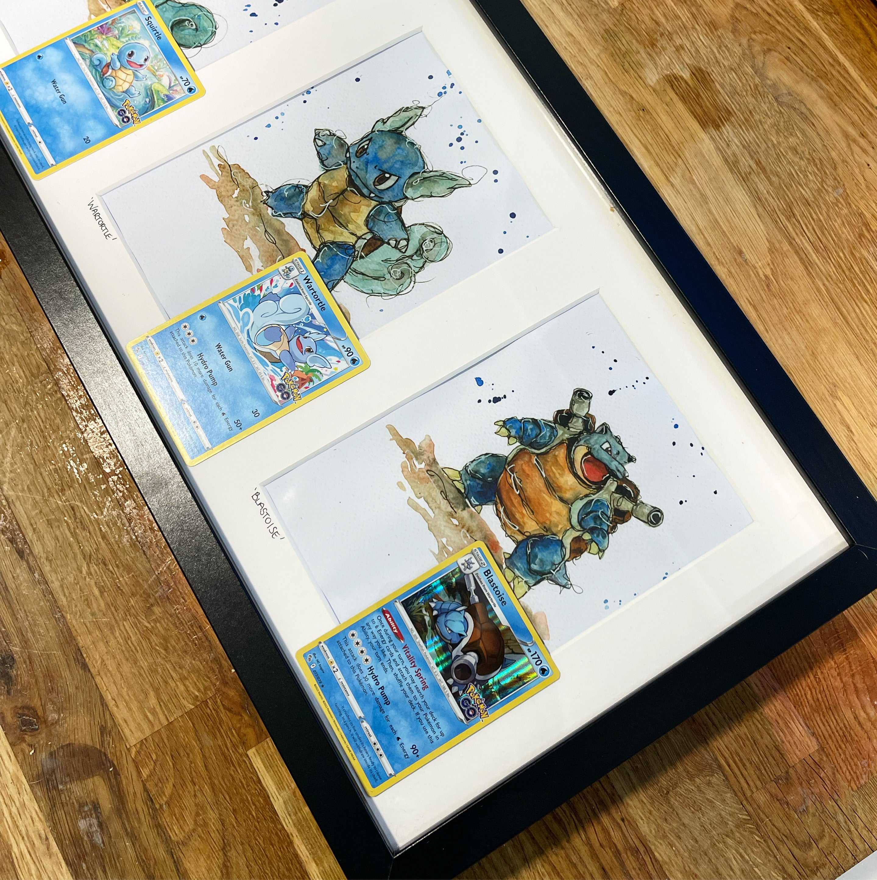 A fine art Giclee print trio, finished with matching original Pokémon cards of each Pokèmon.