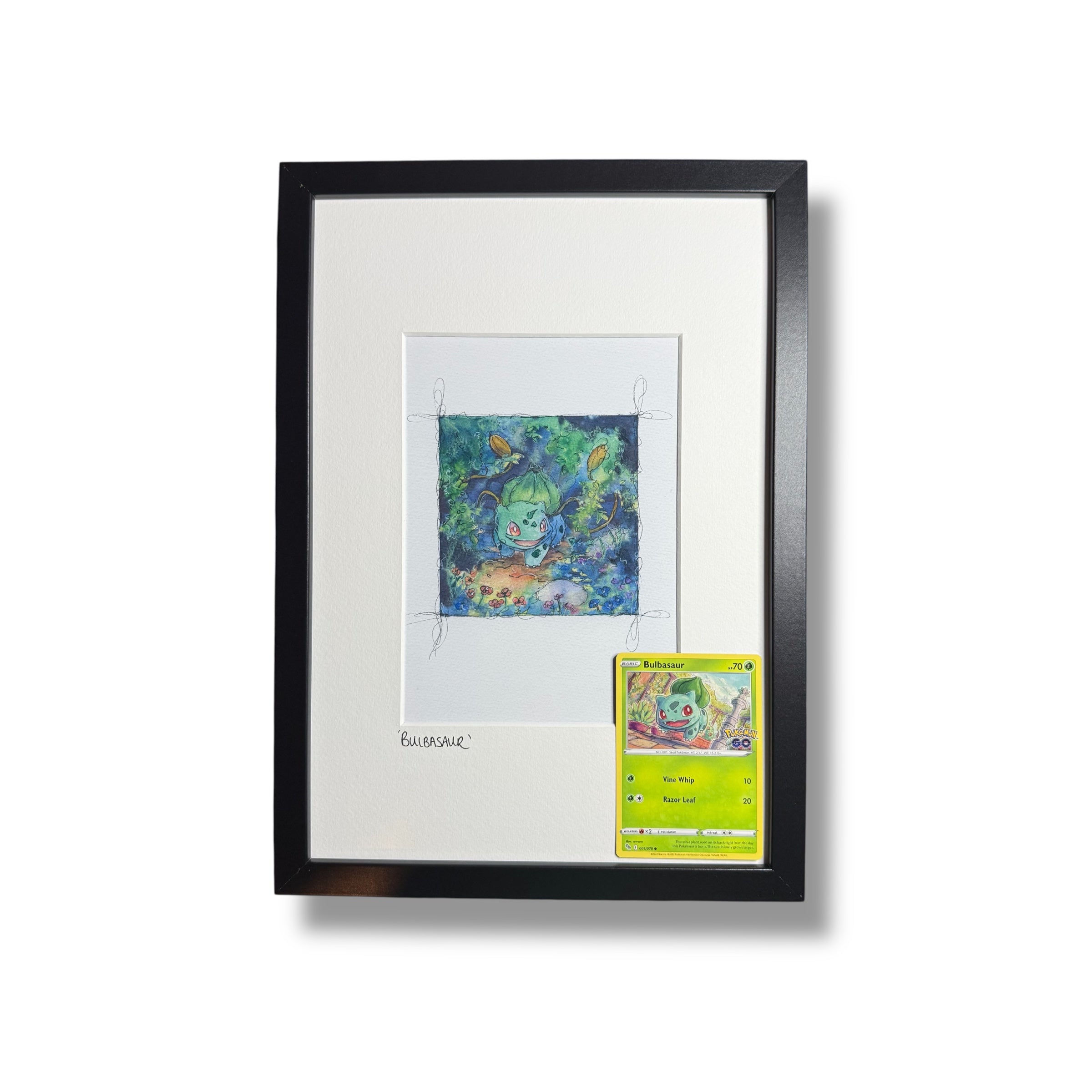 A fine art print framed in an elegant black frame measuring 21x30cm. This piece can either be displayed hung or freestanding. Each piece is framed with a matching original Pokèmon card.