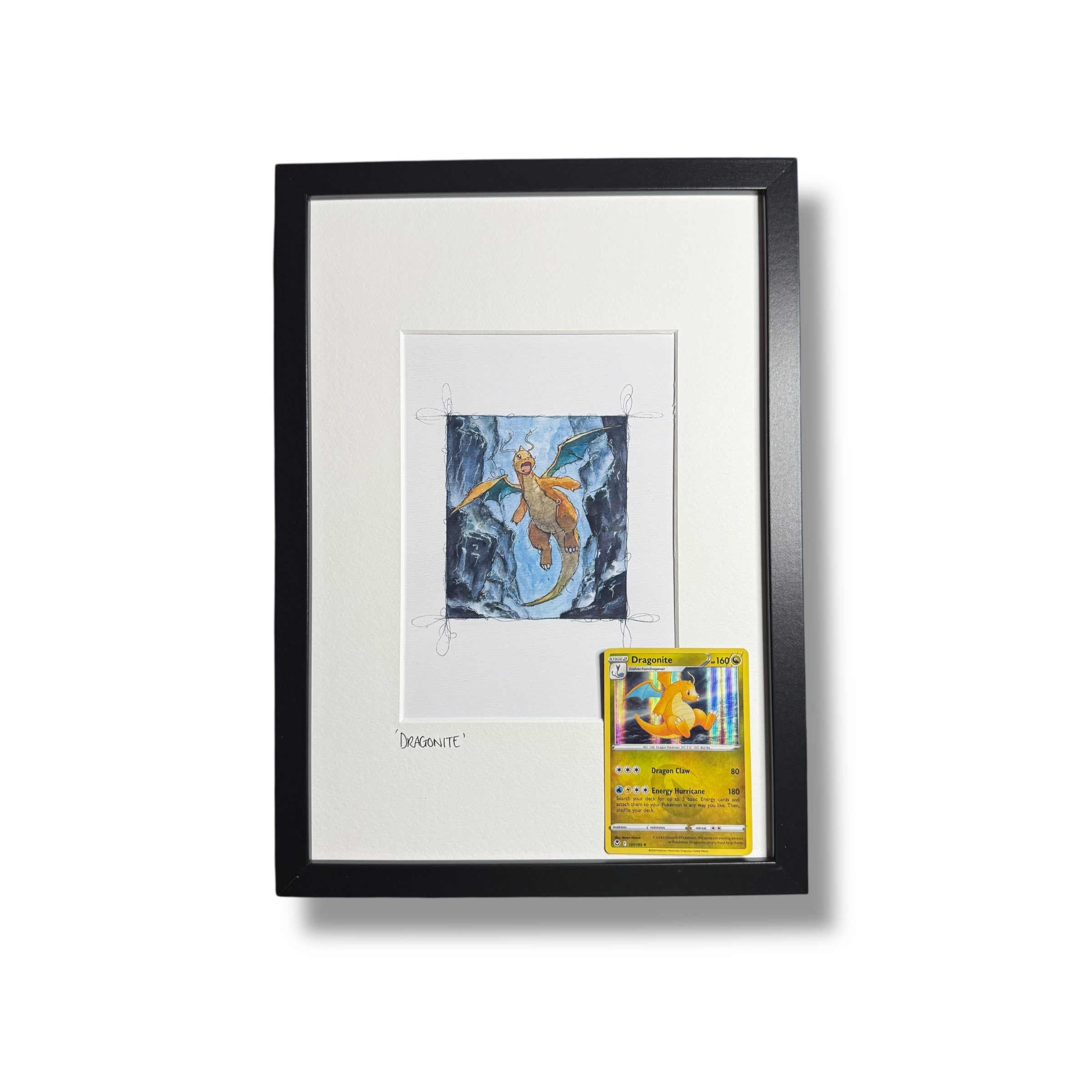 A fine art print framed in an elegant black frame measuring 21x30cm. This piece can either be displayed hung or freestanding. Each piece is framed with a matching original Pokèmon card.