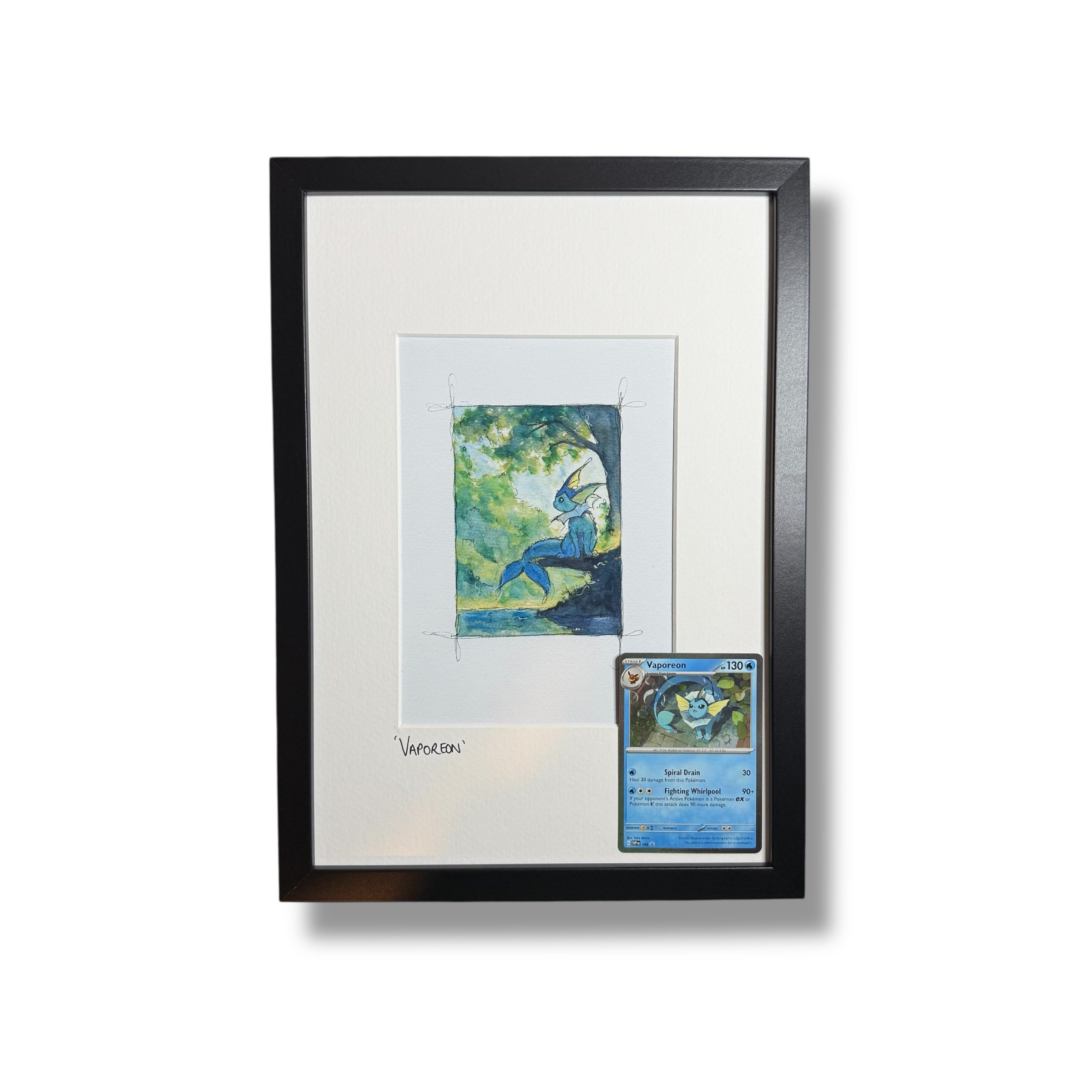 A fine art print framed in an elegant black frame measuring 21x30cm. This piece can either be displayed hung or freestanding. Each piece is framed with a matching original Pokèmon card.