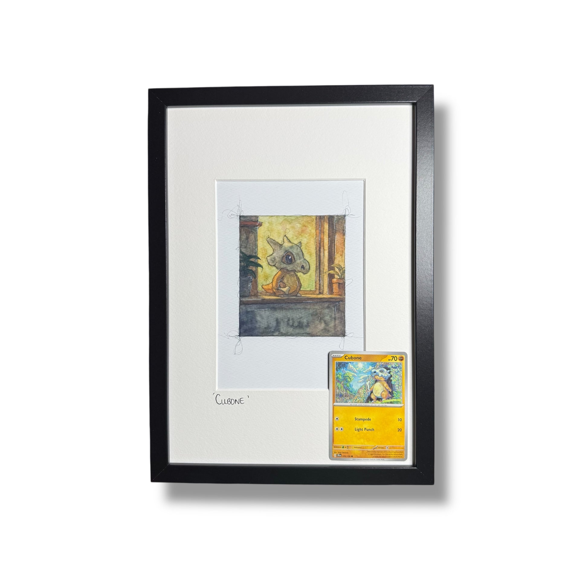 A fine art print framed in an elegant black frame measuring 21x30cm. This piece can either be displayed hung or freestanding. Each piece is framed with a matching original Pokèmon card.